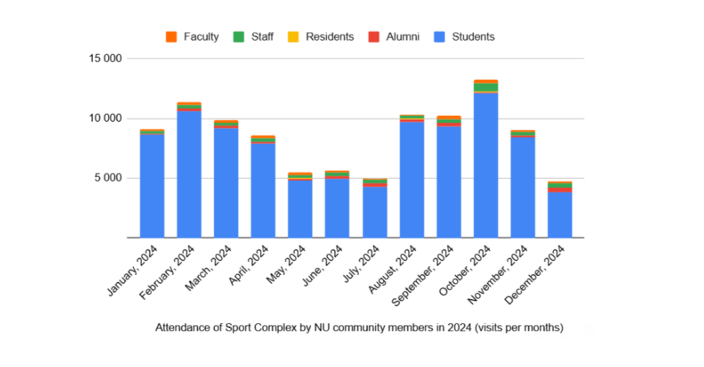 Денсаулық сақтау және әл-ауқат департаменті белсенді өмір салтын және тұрақты дене шынықтыруды насихаттауға ерекше мән береді және төменде көрсетілгендей NU қауымдастығы мүшелерінің Спорт кешеніне келіп-қатысуын талдады: